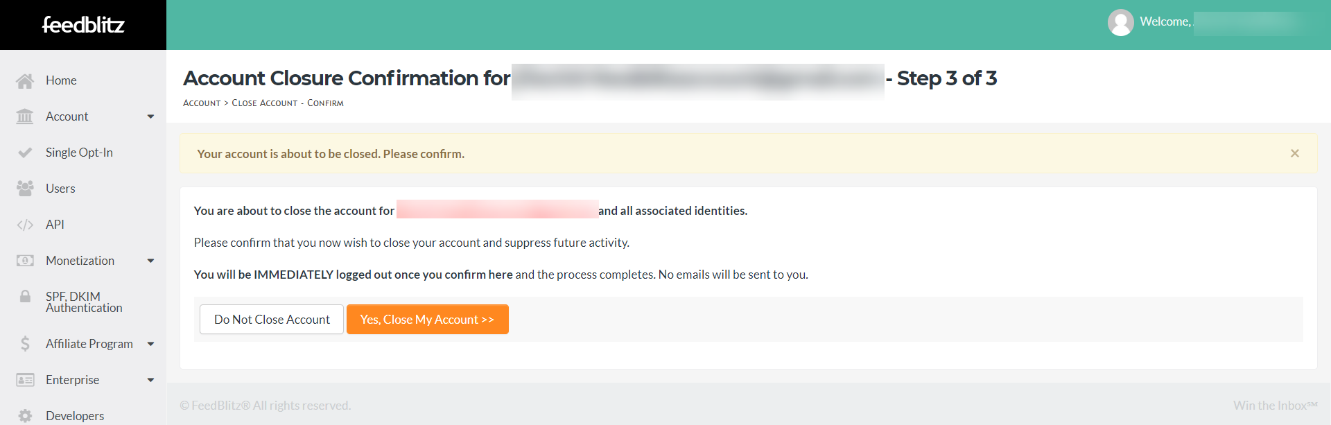 From here, we confirm three times that you indeed want to close your FeedBlitz account. Many people, we've found, don't realize this process will unsubscribe you from any FeedBlitz-serviced newsletters as well, so we do our best to be extremely clear on this. The closing screens are as follows: